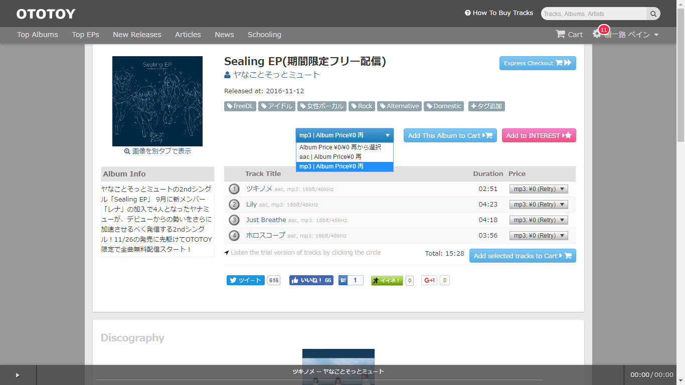 มาถึงหน้าดาวน์โหลดเพลงครับ อย่างอันนี้เป็นของ YanaMyu ที่ให้ดาวน์โหลดฟรีครับ ซึ่งเราสามารถเลือกว่าจะซื้อแบบแพลตฟอร์มไหนเมื่อเลือกเสร็จก็กด Add this album to cart