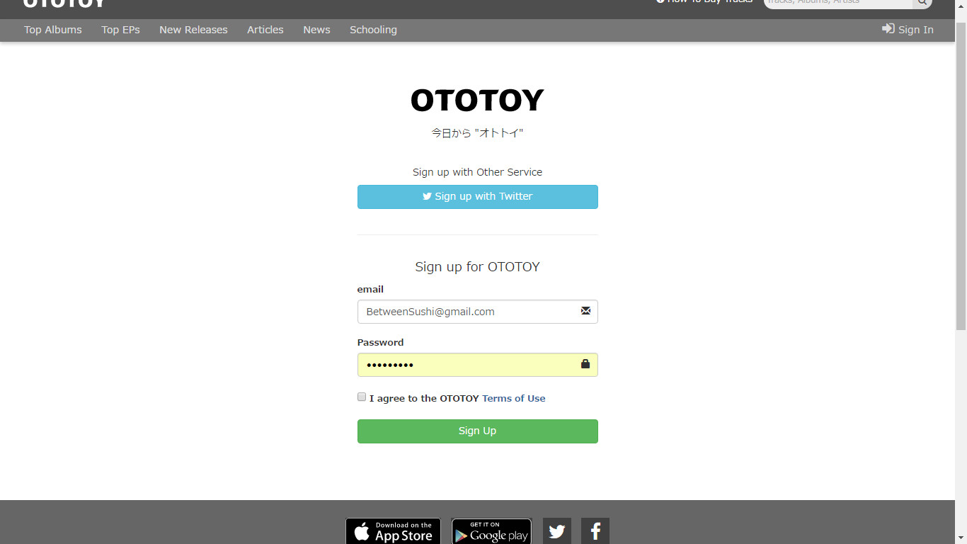 เมื่อกดเข้าไปก็เลือกเอาครับว่าจะ Sing up ด้วย Twitter หรือจะสมัครโดยใส่อีเมล และพาสเวิร์ด และรอยืนยันอีเมลฮะ