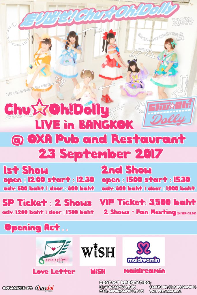 2017年9月23日(土)に OXA Pub and Restaurant にて「Chu☆Oh!Dolly」さんのワンマンライブを開催致します!そして、当日にタイのゲスト「めいどりーみん」、「Love Letter」、「Wish」Opening Actとして出演します!